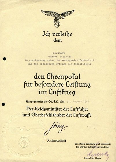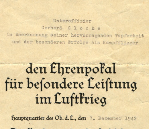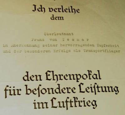 | As for many other military and civil awards of the Third Reich period, the EHRENPOKAL was accompanied by a document or "urkunde". Collectors will encounter two types of certificate. Early examples generally have Göring's original signature placed on the lower right of the document. At times these were signed on his behalf by Generalfeldmarschall Milch.