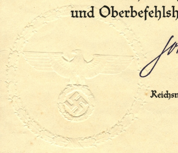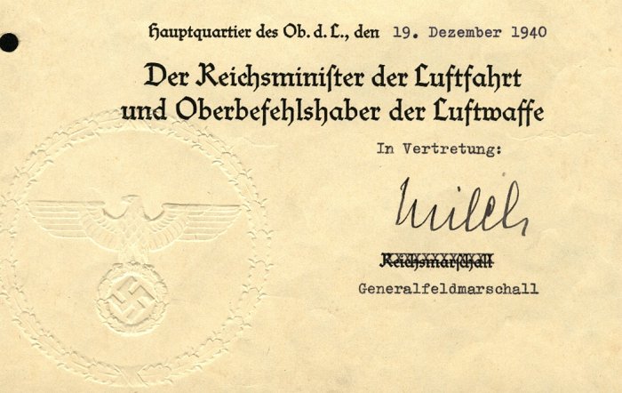 The urkunde pictured to the right is the second type which has the ink-stamped signature of the Reichsmarschall positioned centrally. This type also has a second signature which appears in the bottom right corner ... that of the Head of the Luftwaffe Personnel Department. |