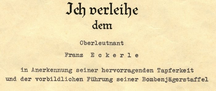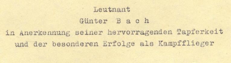 The recipient of the complete document pictured above was German Cross winner Günter Bach, a pilot in KG3. Note the characteristic typed details .... rank, name, type of flyer