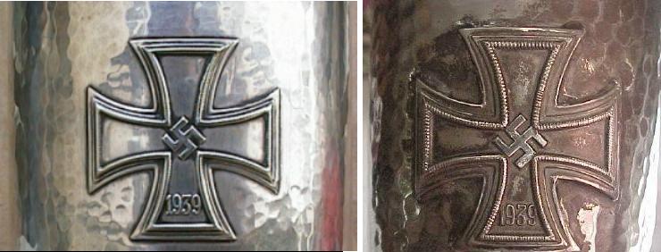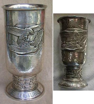Perhaps of greater concern to collectors, however, is the so-called "up-graded" Honor Goblet. With these forgeries, the original recipient's name is erased and replaced with that of someone deemed to be more 'famous', for example, a noted Ritterkreuztrager. One of the authors has identified two examples which may have been enhanced in this way. Photographs, however, can not be published. If you see a goblet for sale purporting to be that of a 'famous' airman examine it very carefully.