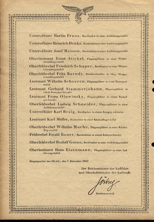 Recipients' details were published in the "Ehrenliste der Deutschen Luftwaffe", a regularly issued bulletin which also recorded awards of the Deutsches Kreuz.
