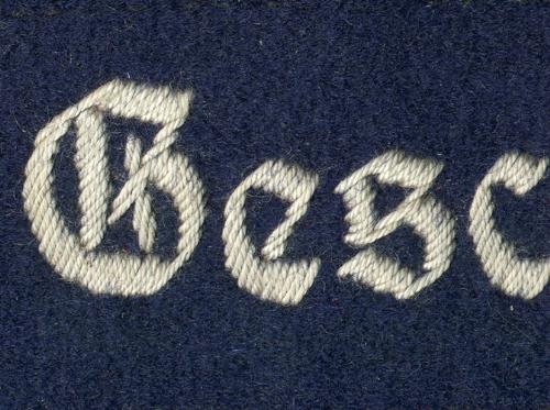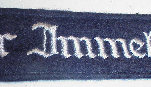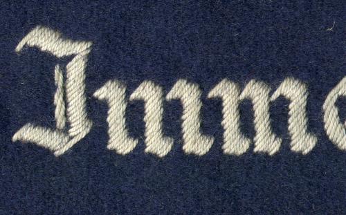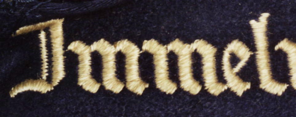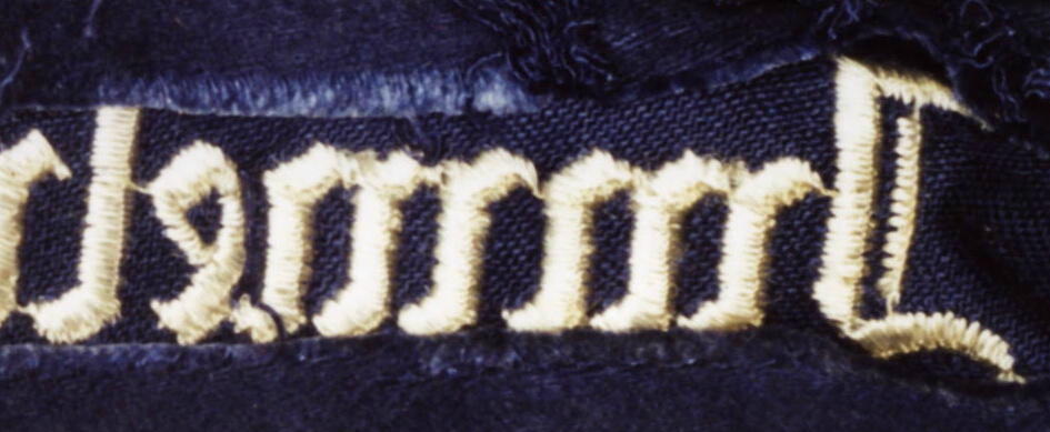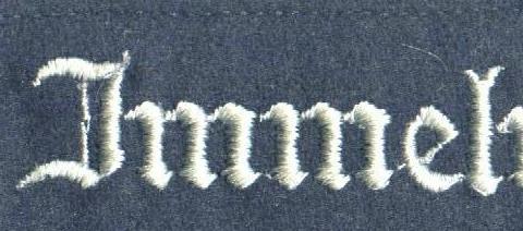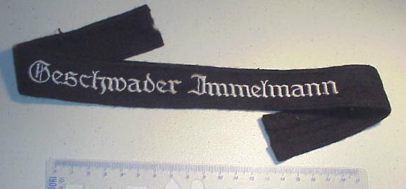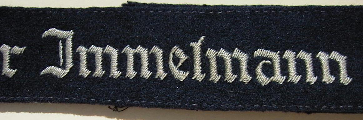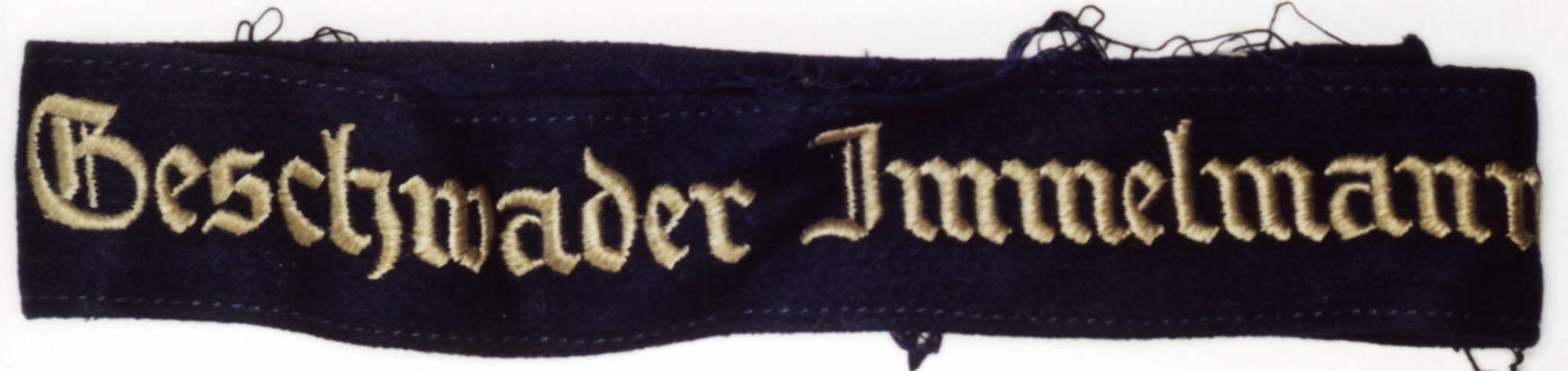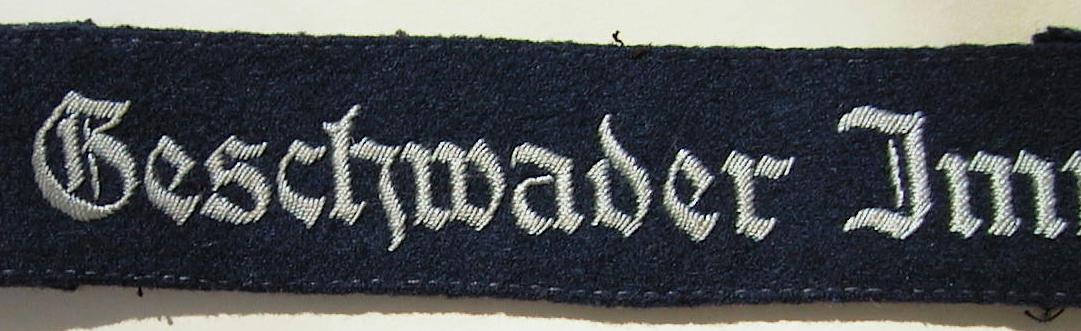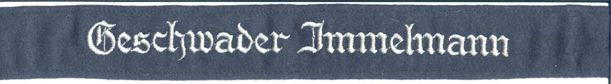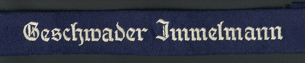 The cuffband bore the inscription “Geschwader Immelmann” in the usual Gothic script lettering, in either machine or hand- embroidery with silver-grey or matte-grey yarn for enlisted men and NCOs, and aluminum wire for officers. It was worn on the lower right sleeve.