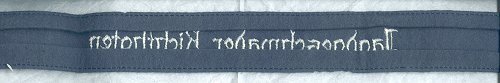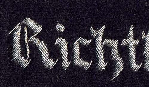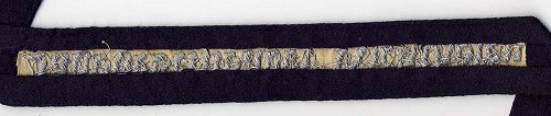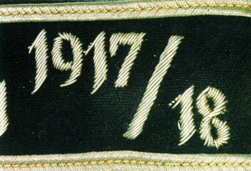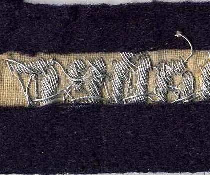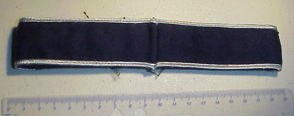 The band was worn on the lower right sleeve by all ranks within the unit in hand-embroidered aluminum yarn for officers and hand or machine-embroidered silver-grey or matte-grey yarn for enlisted men and NCOs. No braid was worn on the borders of the band.