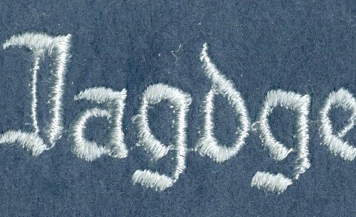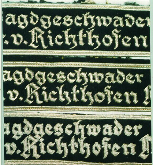 A variation also exists in hand-embroidered aluminum thread with aluminum Russia-braid, which reads “Jagdgeschwader Frhr. v. Richthofen Nr. 1 1914/18". This example is in the Luftwaffe Museum in Gatow, Berlin. It is not known who the original wearer was.