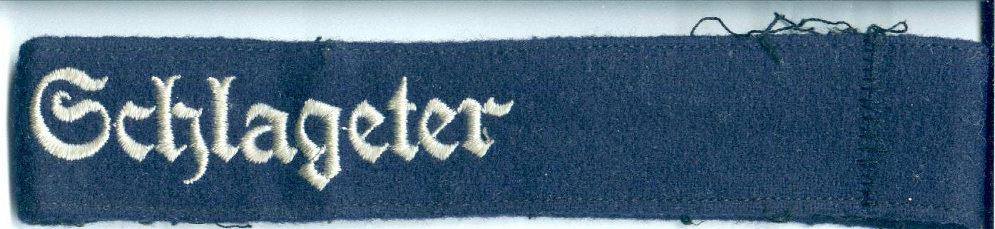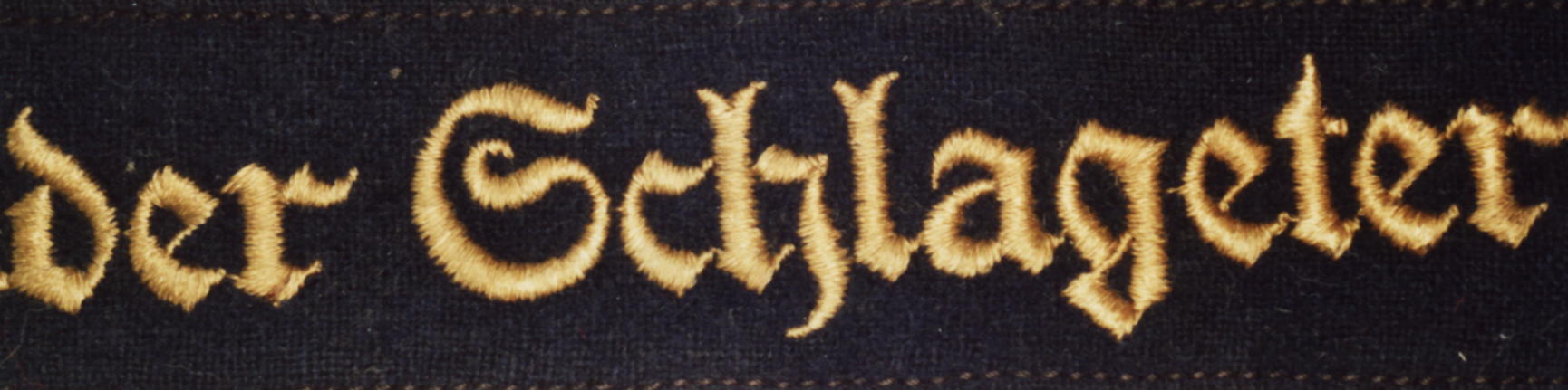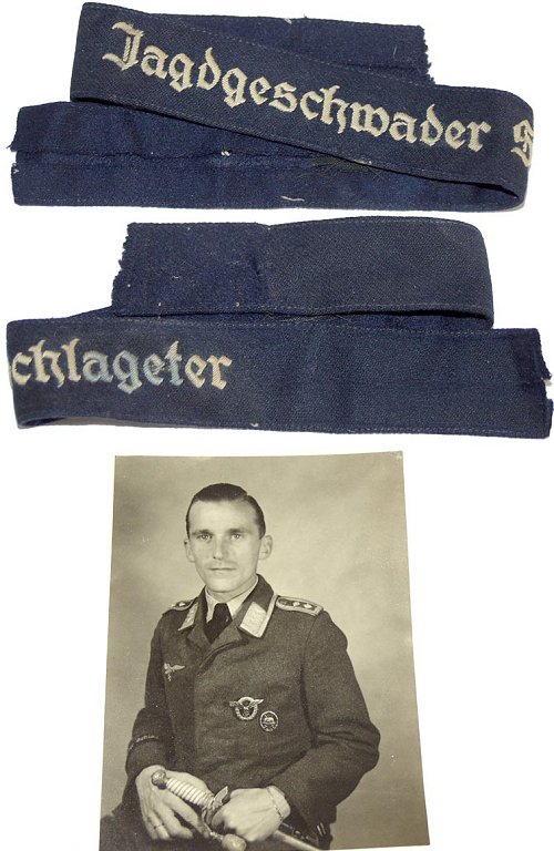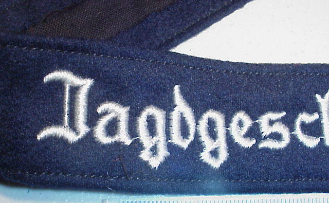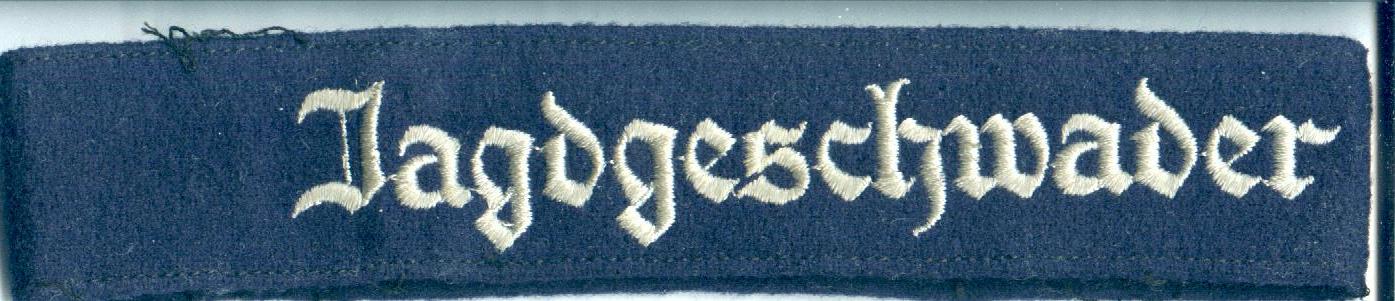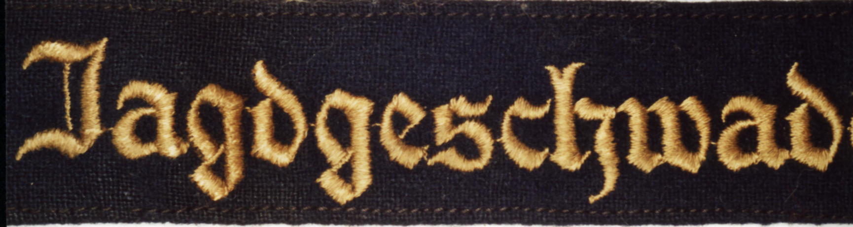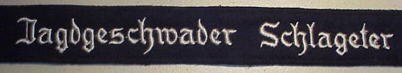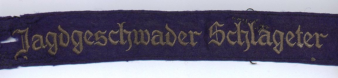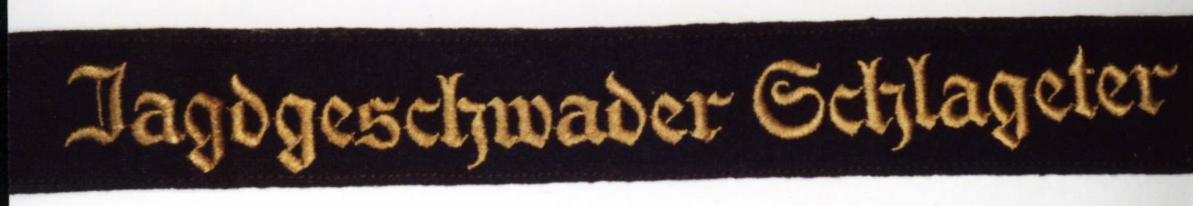 The cuffband bore the inscription “Jagdgeschwader Schlageter” in the usual Gothic script lettering on a dark blue base and was worn on the lower right sleeve.