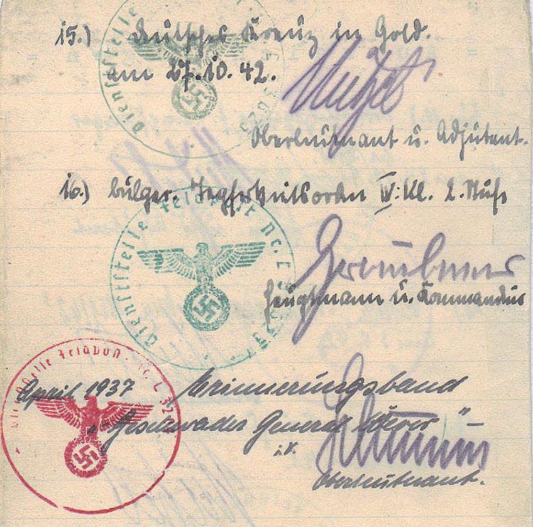 awarded the German Cross in Gold on 27 October 1942 (as a Hauptmann).