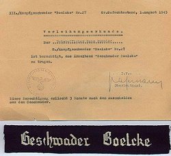 A Verleihungsurkunde for the Geschwader Boelcke cuff band awarded to Unteroffizier Hans Rummler, dated 1 August 1943.